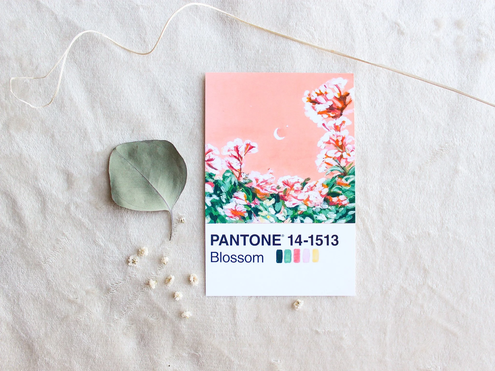 My Pantone Collection features a set of 30 Pantone Paintings, each hand painted in gouache and acrylic on Pantone postcards. Each painting uniquely plays to the color way featured on the Pantone chip, and the variety of subject matter reflects the inspiration I take from the vivid colors all around us.